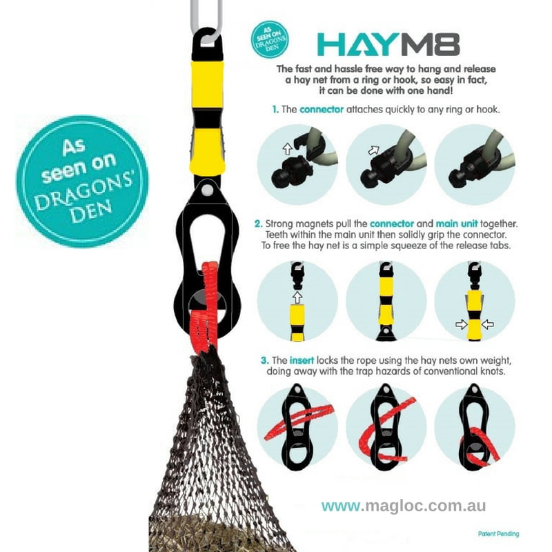 The Magloc Haym8 is a new unique device developed with the Magloc K9 unit to create a single-handed connection and release unit for connecting a horses hay net to a wall ring.